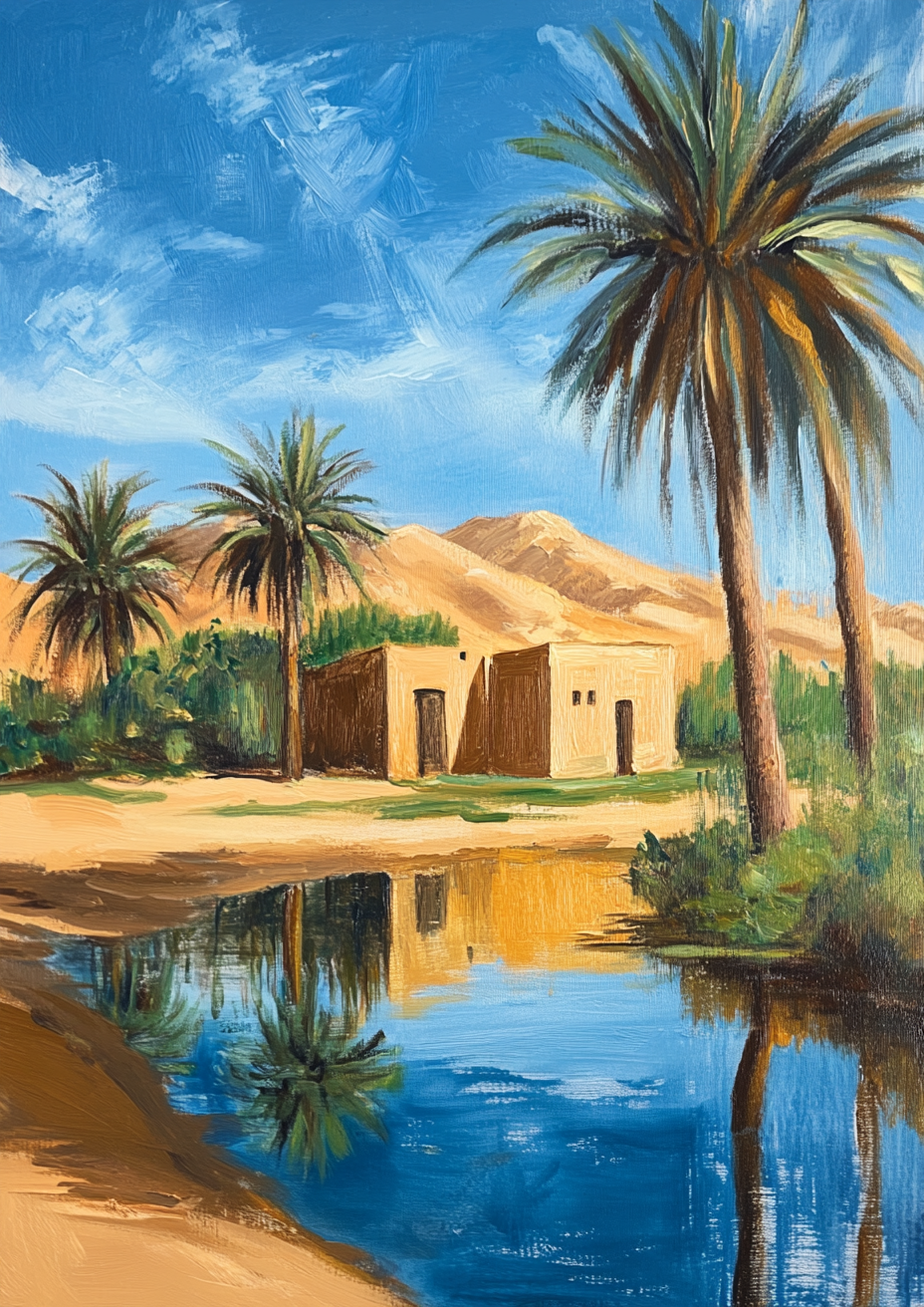 A place where the land provides, the architecture endures, and the culture thrives in quiet resilience. It captures the essence of Saudi heritage not through grandeur, but through balance: homes rooted in earth, palms reaching skyward, and water reflecting it all like memory made visible.