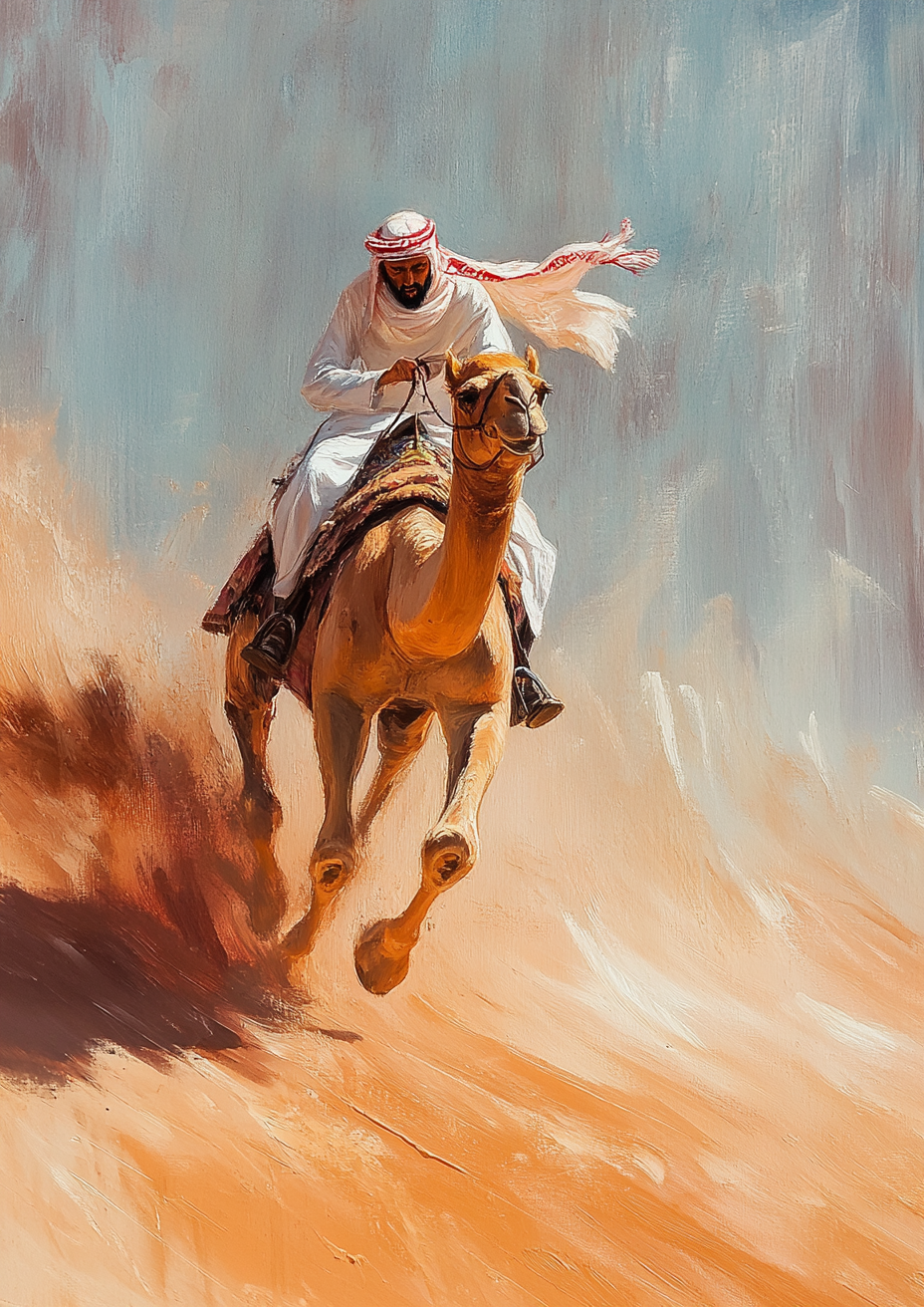 This piece is a celebration of raw tradition in motion. A lone rider surges through the sand, wrapped in flowing white, his camel thundering forward with dust trailing behind. It is a moment of unrelenting will, where history and adrenaline collide.