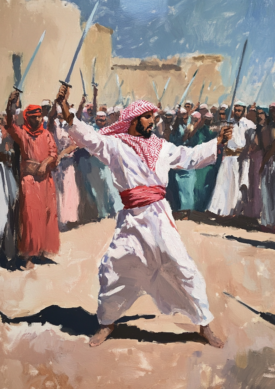 This piece captures the essence of Ardah, a traditional sword dance performed as both celebration and declaration. At its center, a man dances with strength and grace, surrounded by his people, his heritage, his history. It’s not just a performance, it’s remembrance, unity, and identity in motion.