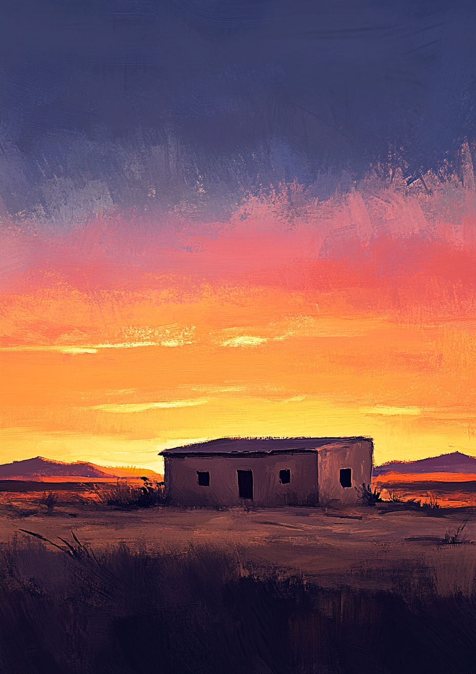 A portrait of stillness before movement, of silence before sound. A humble desert hut rests as dawn stretches across the sky, bathing the barren land in the warmth of possibility.