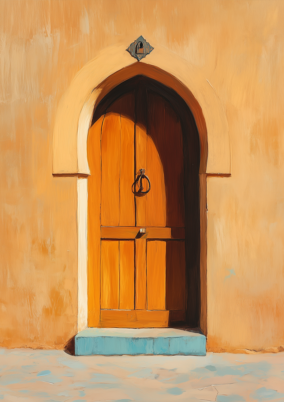 This piece centers on the quiet elegance of a traditional doorway; timeless, sunlit, and still. The closed door symbolizes both mystery and hospitality, privacy and openness. It invites curiosity without revealing too much, standing as a metaphor for cultural warmth and personal boundaries.