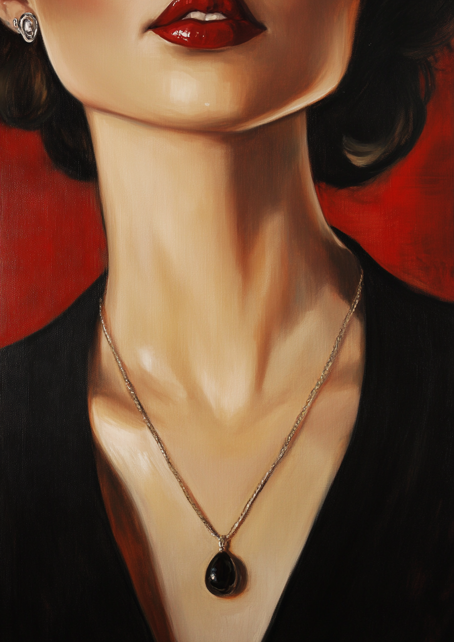 This work is a portrait of restraint. A single pendant, resting gently at the collarbone, becomes the quiet center of attention.