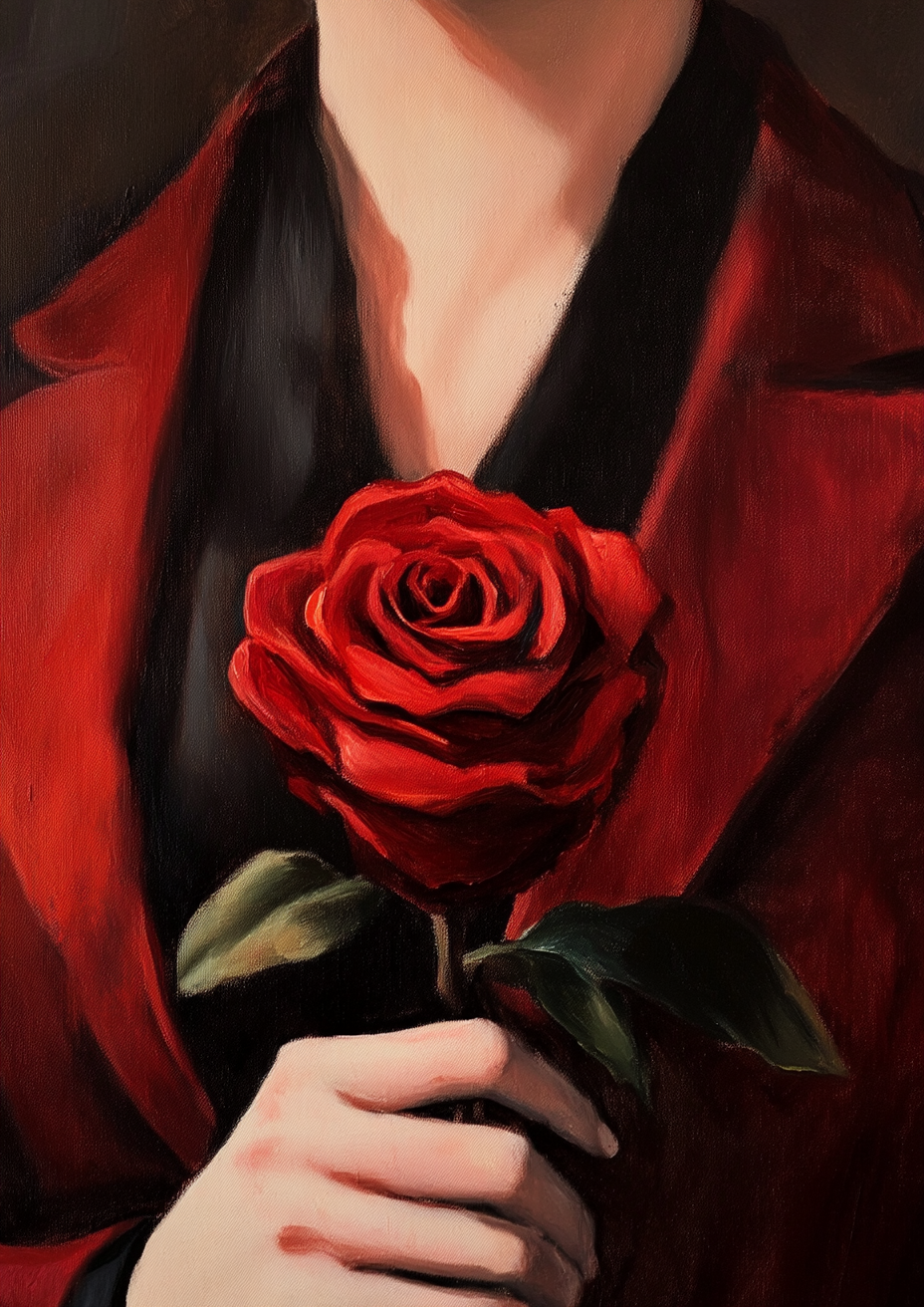 This work is a portrait of quiet authority. Every detail, the silk jacket, the poised hand, the flawless bloom, is chosen, placed, and held with purpose.