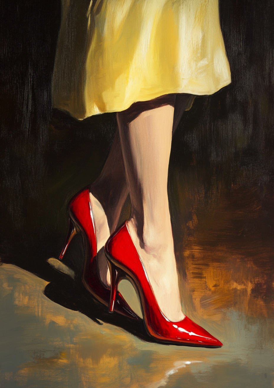 This work is a portrait of composed confidence. A pair of crimson stilettos, radiant under warm light, speaks volumes without a word.